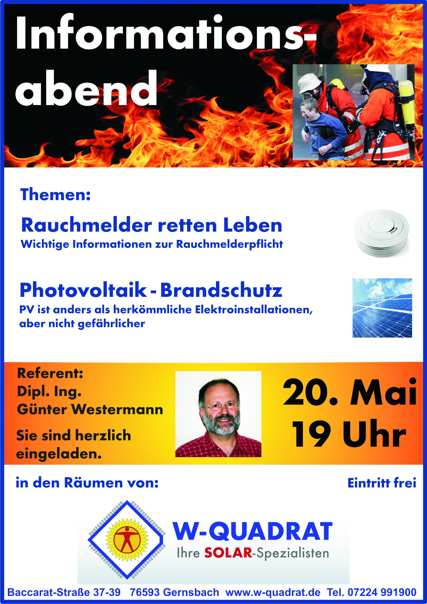 Rauchmelder retten Leben Wichtige Informationen zur Rauchmelderpflicht. Photovoltaik - Brandschutz PV ist anders als herkömmliche Elektroinstallationen, aber nicht gefährlicher 20. Mai 2014 19 Uhr In den Räumen von W-QUADRAT